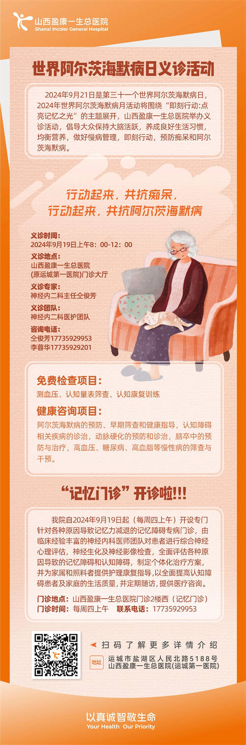 2024年9月21日是第三十一個世界阿爾茨海默病日,2024年世界阿爾茨海默病月主題為“行動起來,共抗癡呆,行動起來,共抗阿爾茨海默病”,9月19日我院神經內科將舉辦“預防癡呆,留住愛的記憶”世界阿爾茨海默病日宣傳義診活動。