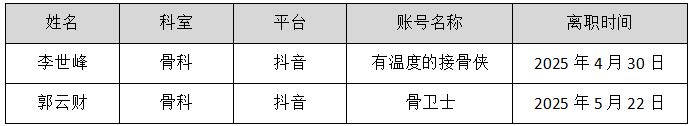 2、醫(yī)院已離職人員,但抖音仍保留我院認(rèn)證信息,如黃V認(rèn)證仍為“山西盈康一生總醫(yī)院”的醫(yī)護(hù),自離職之日起,通過其抖音賬號發(fā)布的所有內(nèi)容,包括但不限于醫(yī)療科普、病例分享、診療建議等,均屬于其個人行為,與我院無關(guān),如因此產(chǎn)生的任何后果,我院不承相關(guān)法律責(zé)任。